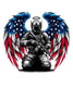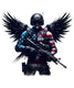 "Shadow Watcher" features a soldier with darkened, raven-like limbs, his face obscured by a visor, adding an air of mystery. Clad in military gear colored in the hues of the US flag, he holds a rifle firmly, embodying a silent and vigilant protector of liberty.