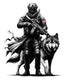 A resolute patriot, draped in the American flag, stands tall, his wolf companion at his side. Armed and ready, he symbolizes the unwavering spirit and sacrifices of those who serve their country.