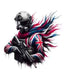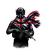 The patriots eyes, focused on a distant horizon, reveal unwavering determination as his is at the ready. Draped across his chest, the British flag proudly displays his strength and patriotism.