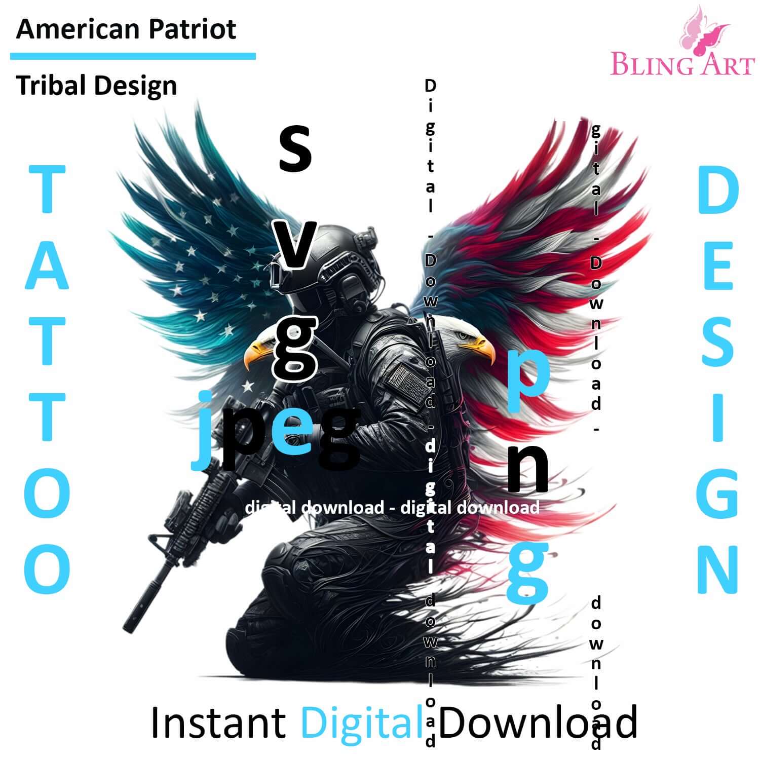 Bling Art Tribal Tattoo Instant Digital Download - American Patriot Soldier - Eagle Soldier 1